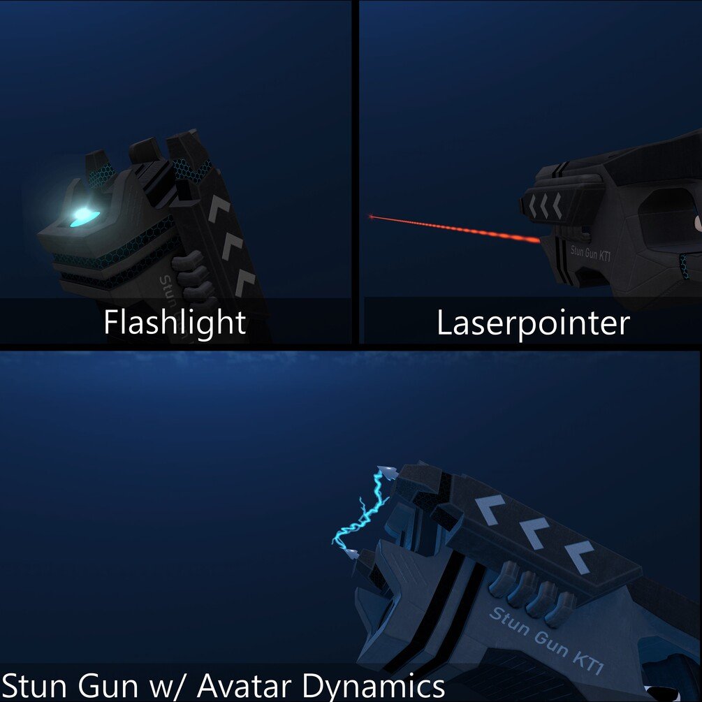 it's a optimized and good looking Stun Gun with unique Animations, Sound design, Particle FX and more! Avatar Dynamics and Gesture Toggles are being used to drive this weapon seamlessly!